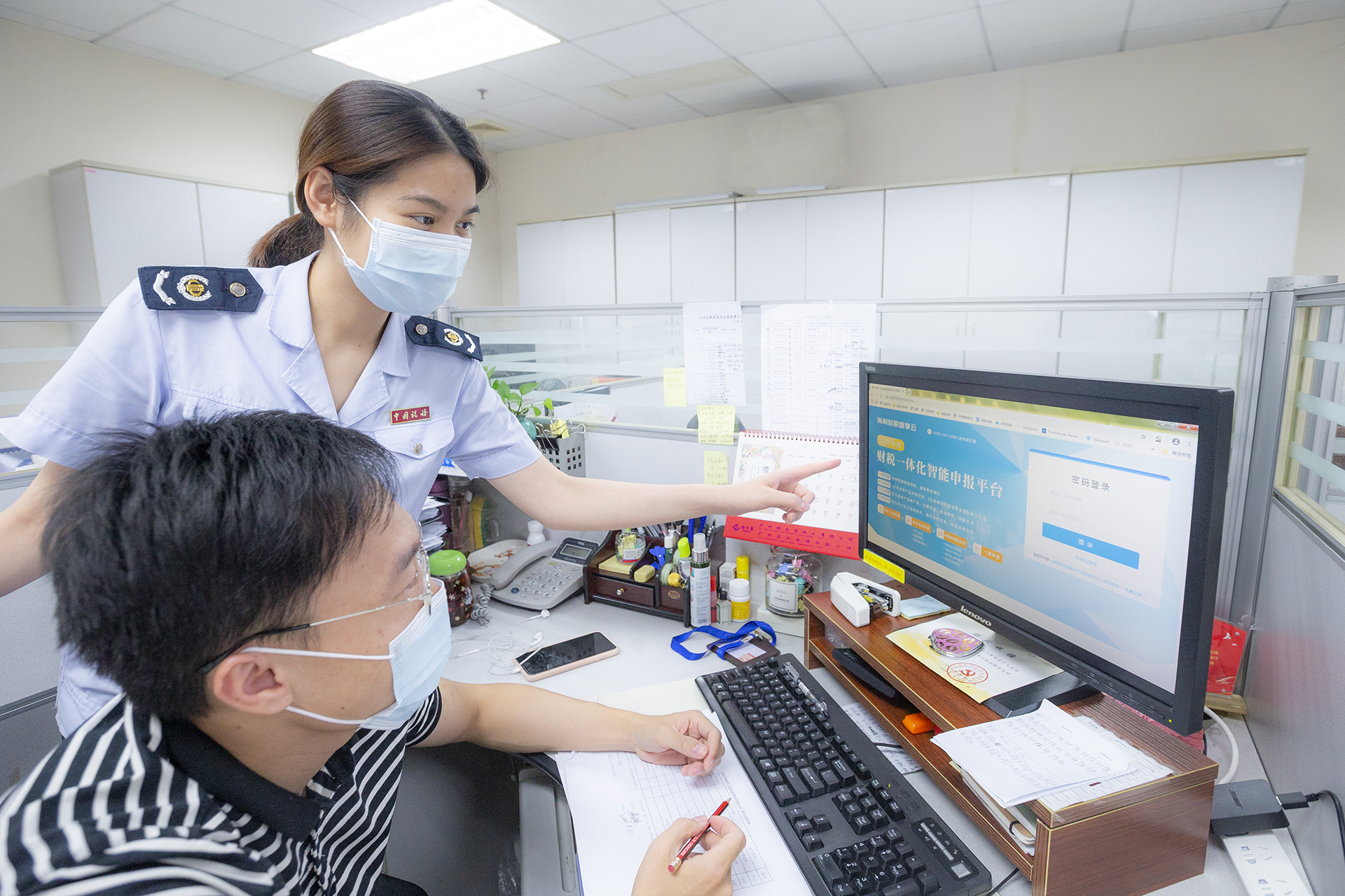 税务人员辅导纳税人使用财税一体化智能申报平台